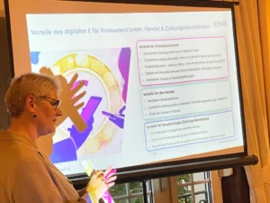 Ein weiterer Programmpunkt war der Vortrag von Doris Rijnbeek, Leiterin der Repräsentanz der Österreichischen Nationalbank (ÖNB) in Brüssel, in der österreichischen Vertretung beim Europarat. Sie informierte über den aktuellen Stand des Projekts „Digitaler Euro“ und räumte mit gängigen Mythen und Falschmeldungen auf: